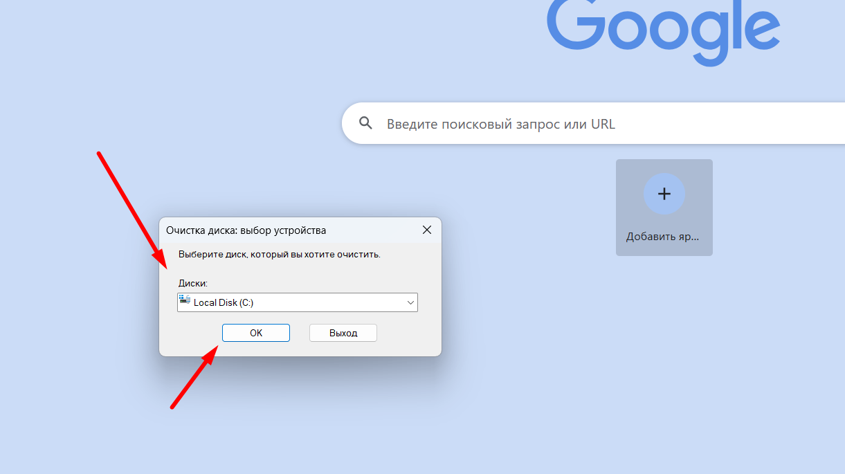 Выберите диск C. Нажмите "Ок"