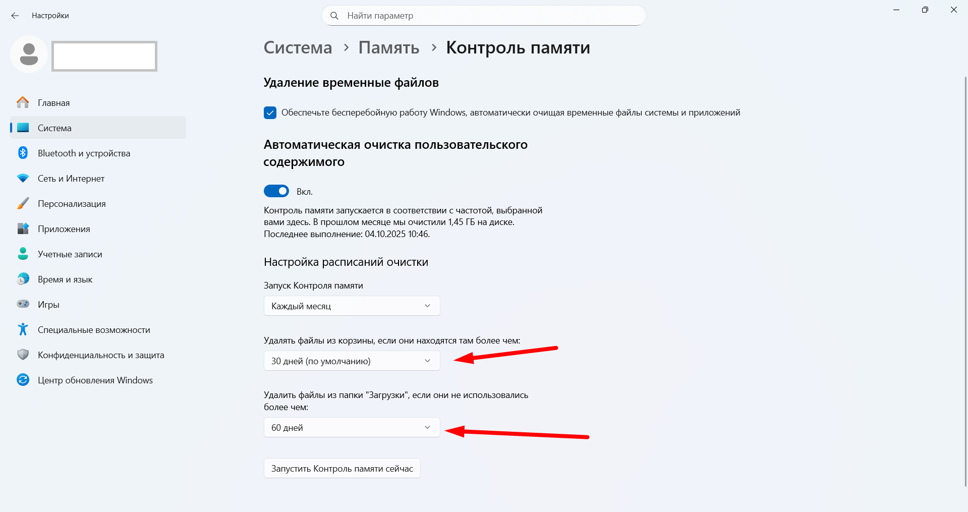 Настройте: удаление временных файлов, очистку корзины раз в 30 дней, очистку папки «Загрузки» раз в 60 дней. Если не хотите дожидаться, когда запуститься сценарий очистки, можете нажать кнопку "Запустить Контроль памяти сейчас"