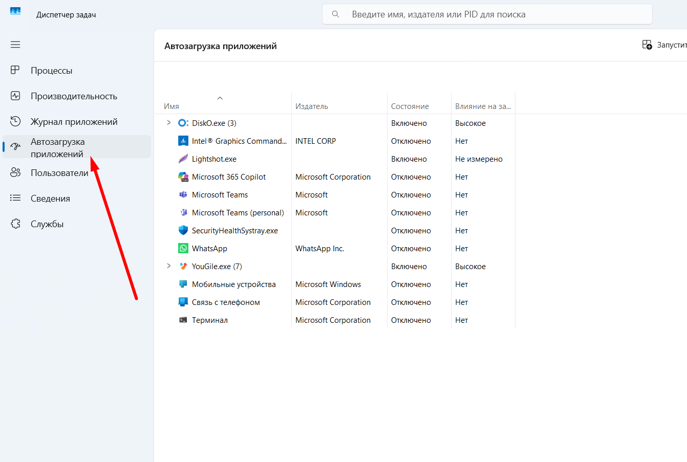 Перейдите во вкладку Автозагрузка.