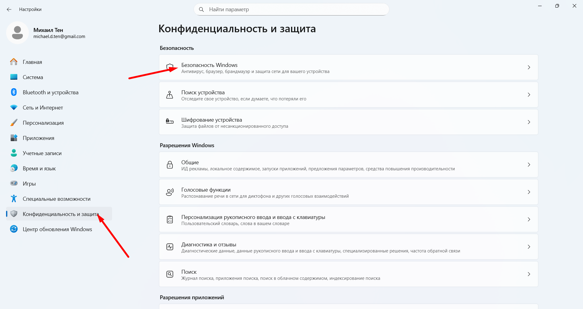 - Нажмите Win + I > Конфиденциальность и защита > Безопасность Windows.