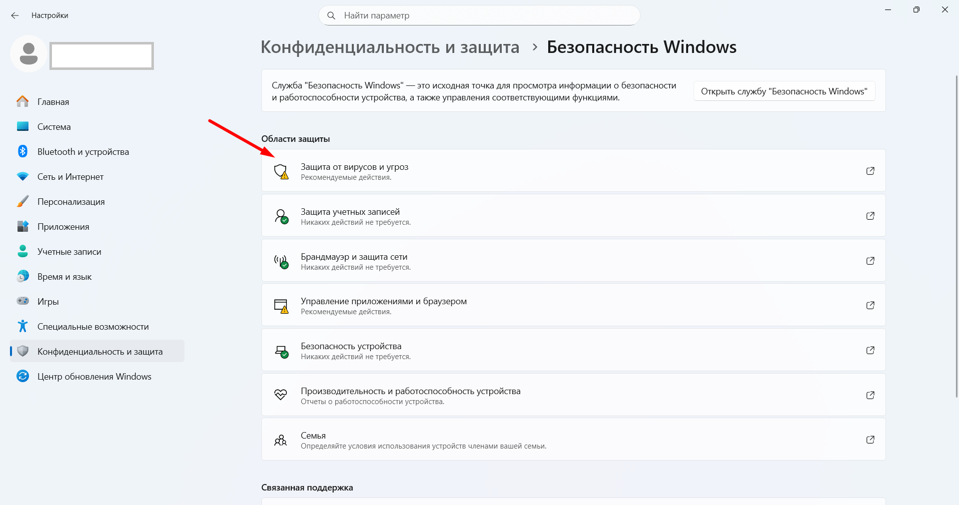 - Далее "Защита от вирусов и угроз"