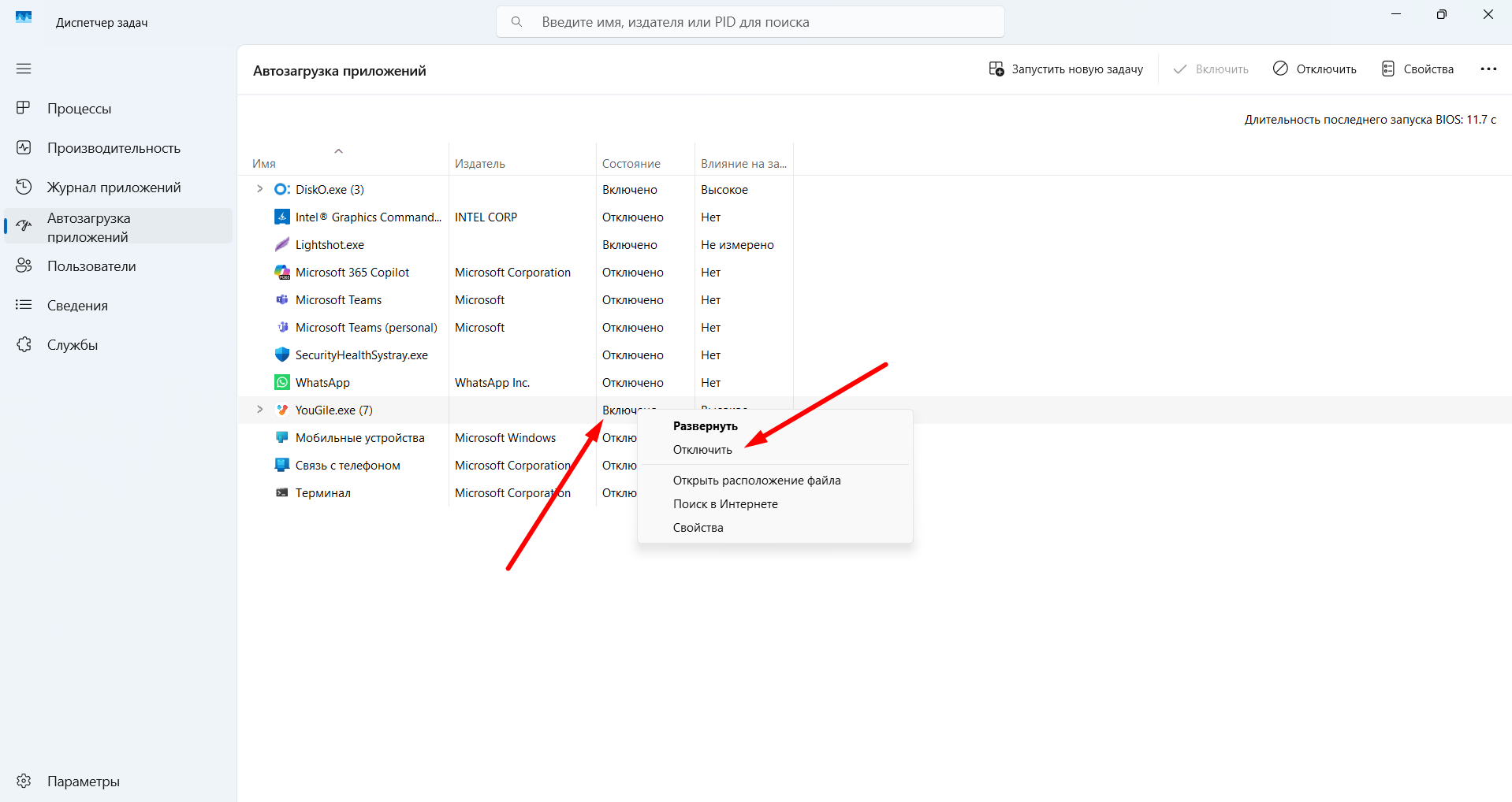- Проверьте, у каких приложений в статусе автозагрузки указано "Включено". Отключите лишнее. Например. OneDrive, Skype, Zoom Updater, Яндекс, Discord. Чтобы отключить, нажмите правой кнопкой мышки по статусу и выберите "Отключить"
