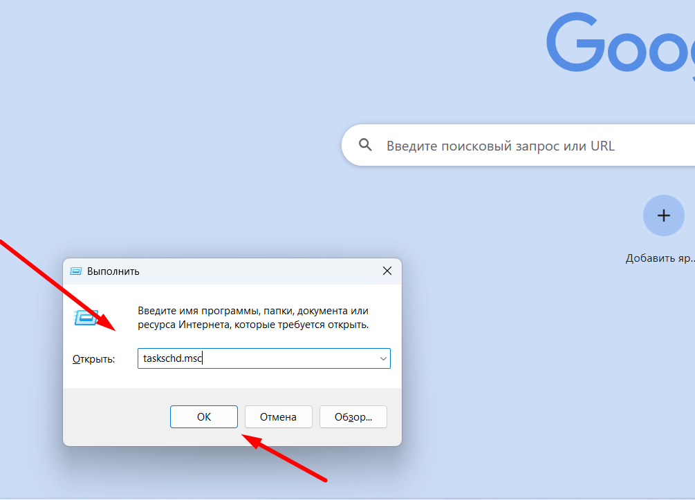 - Нажмите Win + R → введите taskschd.msc.