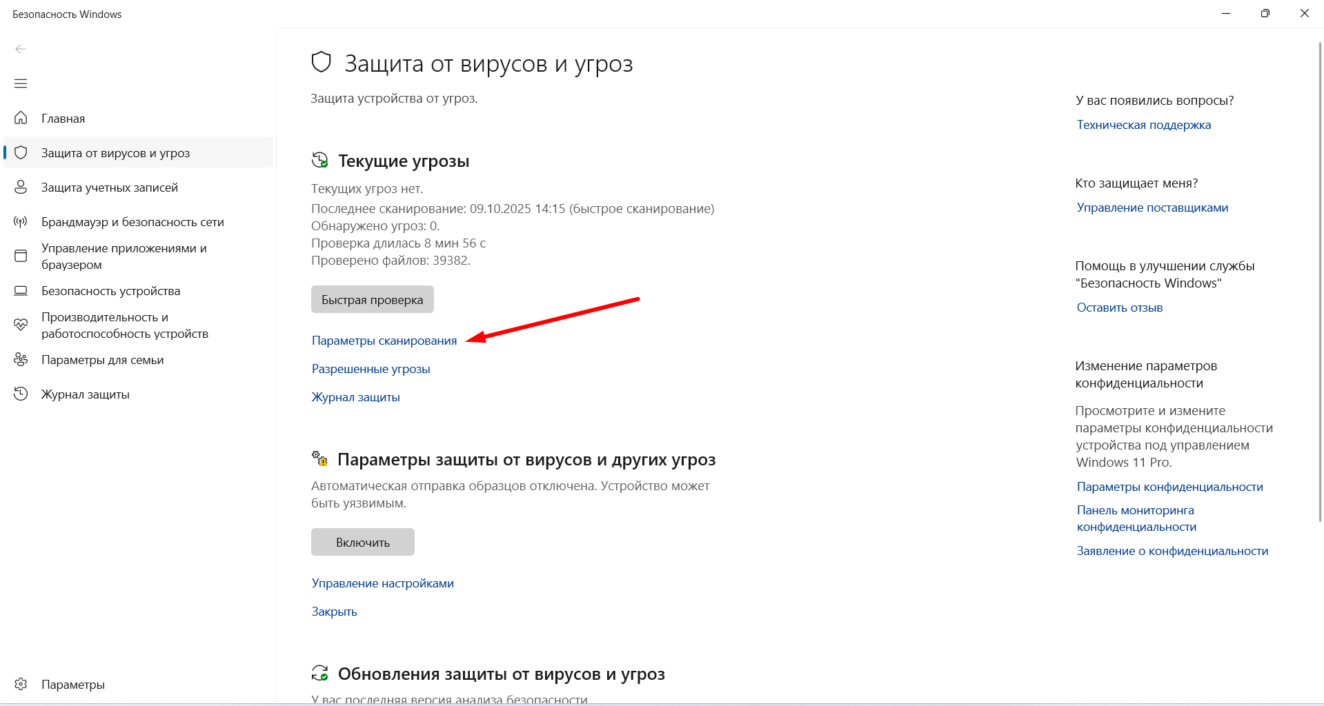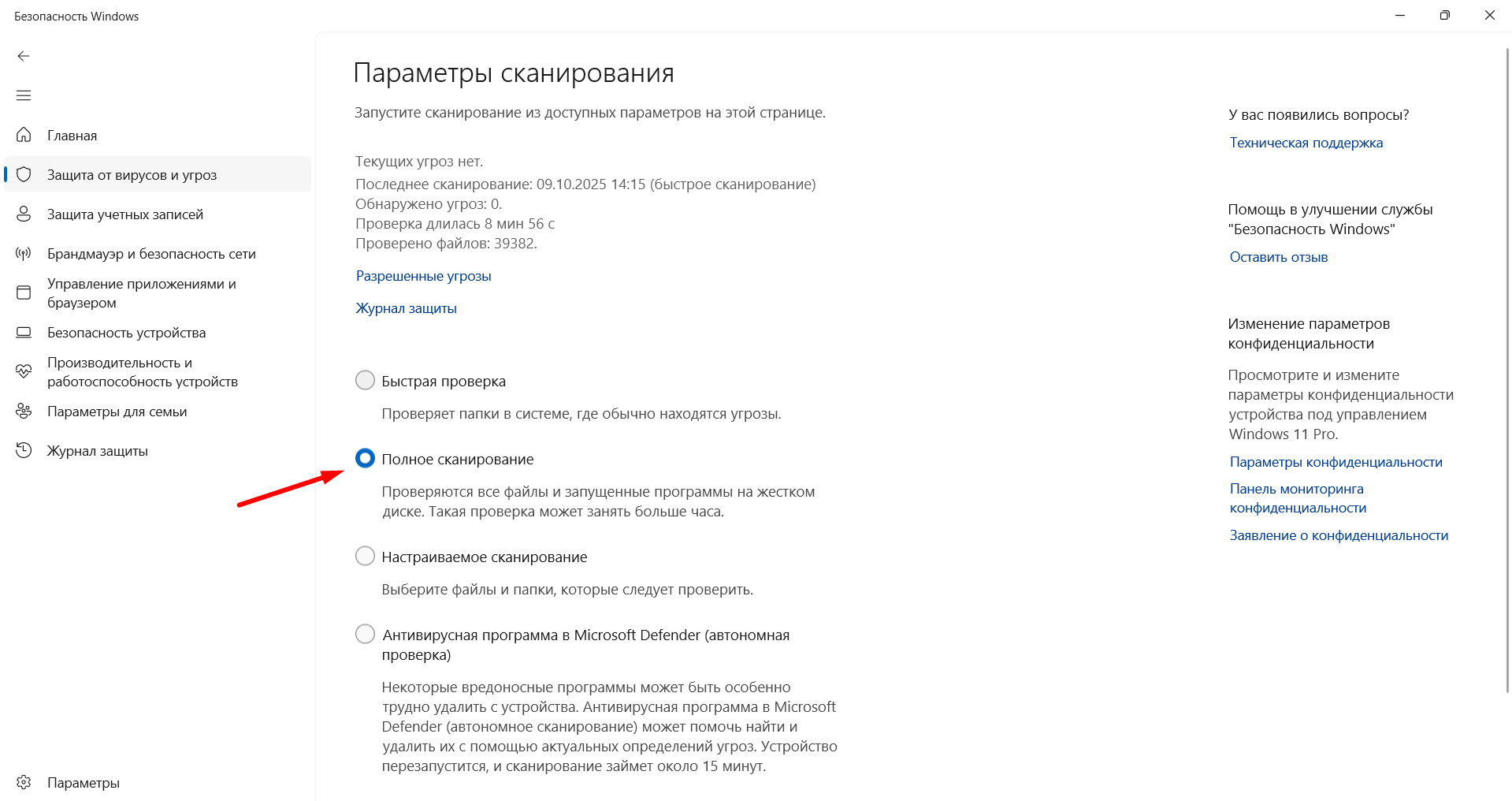 Запускайте «Быструю проверку» раз в неделю, а «Полную» — раз в месяц. Для полной проверки перейдите в пункт "Параметры сканирования"
