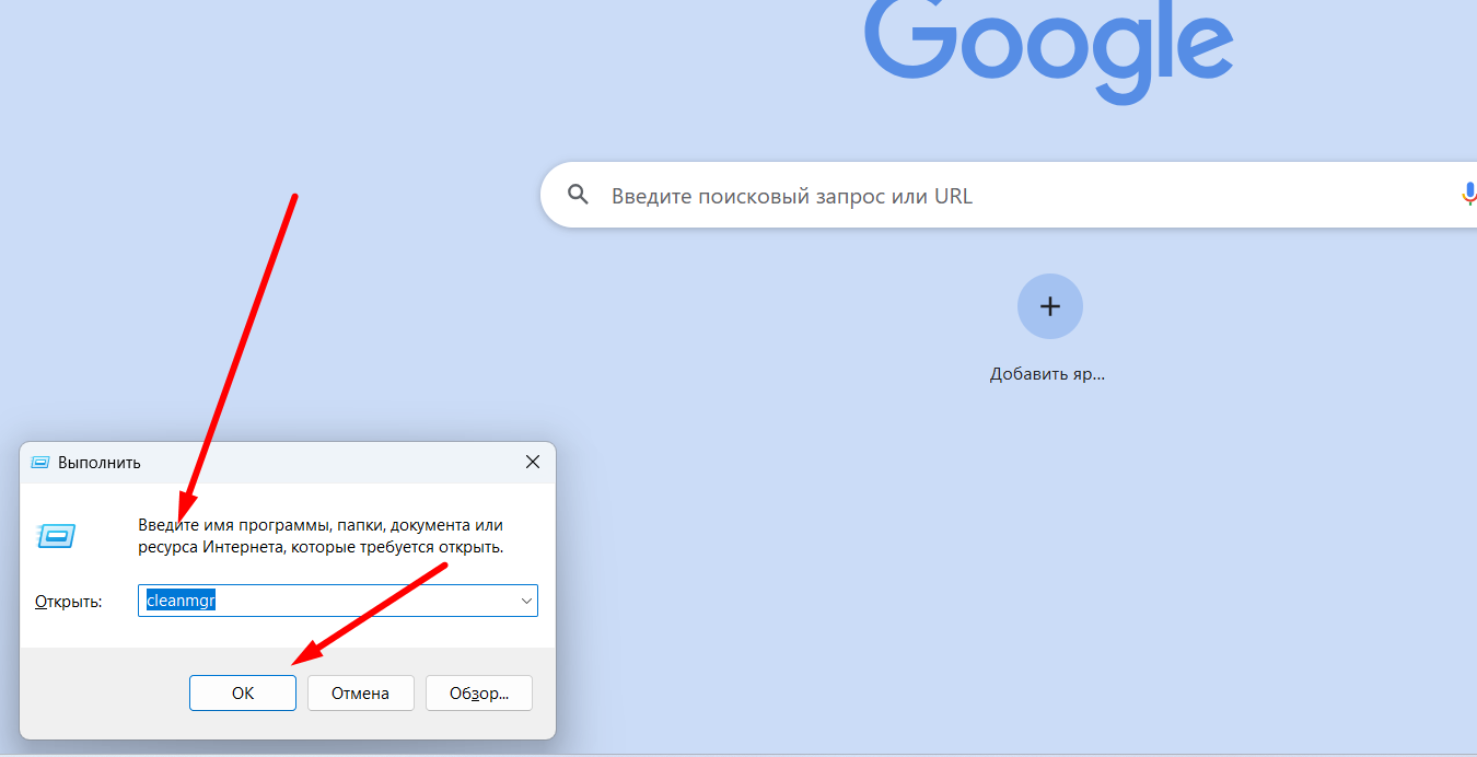 Нажмите Win + R, введите cleanmgr. Нажмите "Ок"