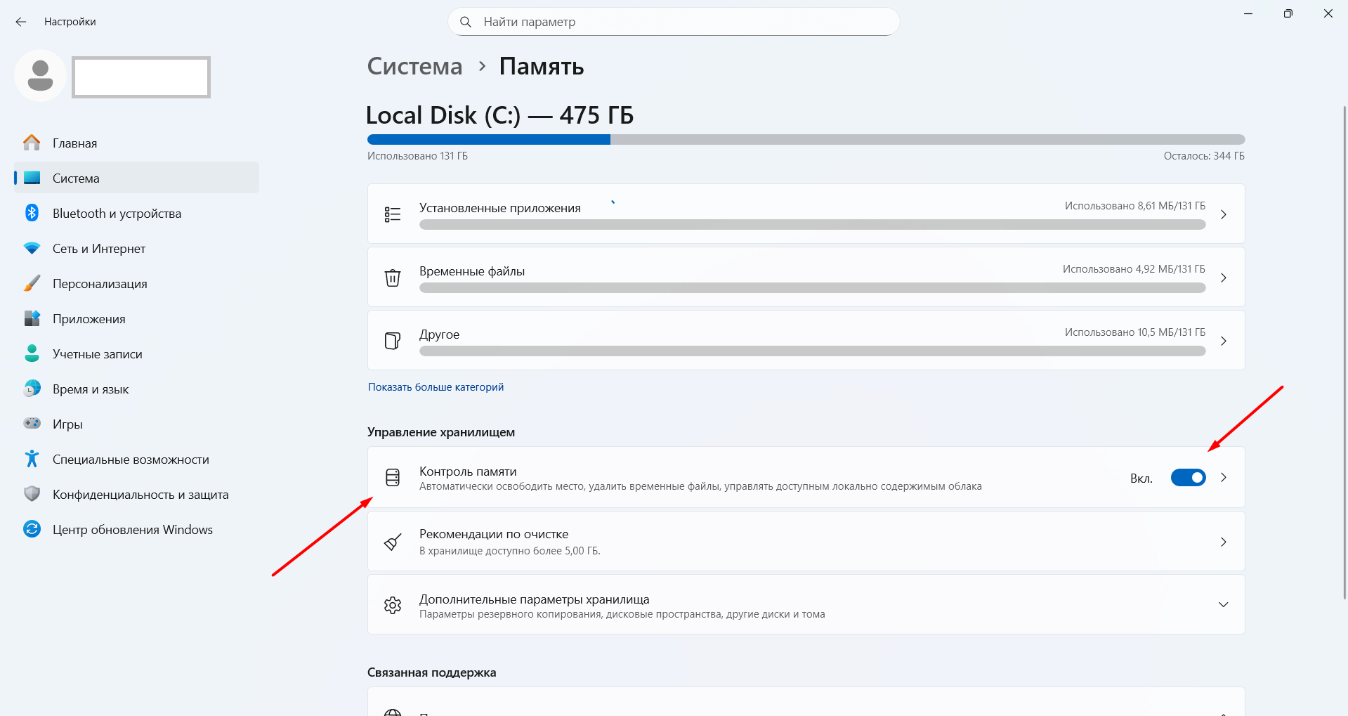 Включите Контроль памяти (Storage Sense). После того, как включите, нажимаете на этот раздел и проваливаетесь в настройки.