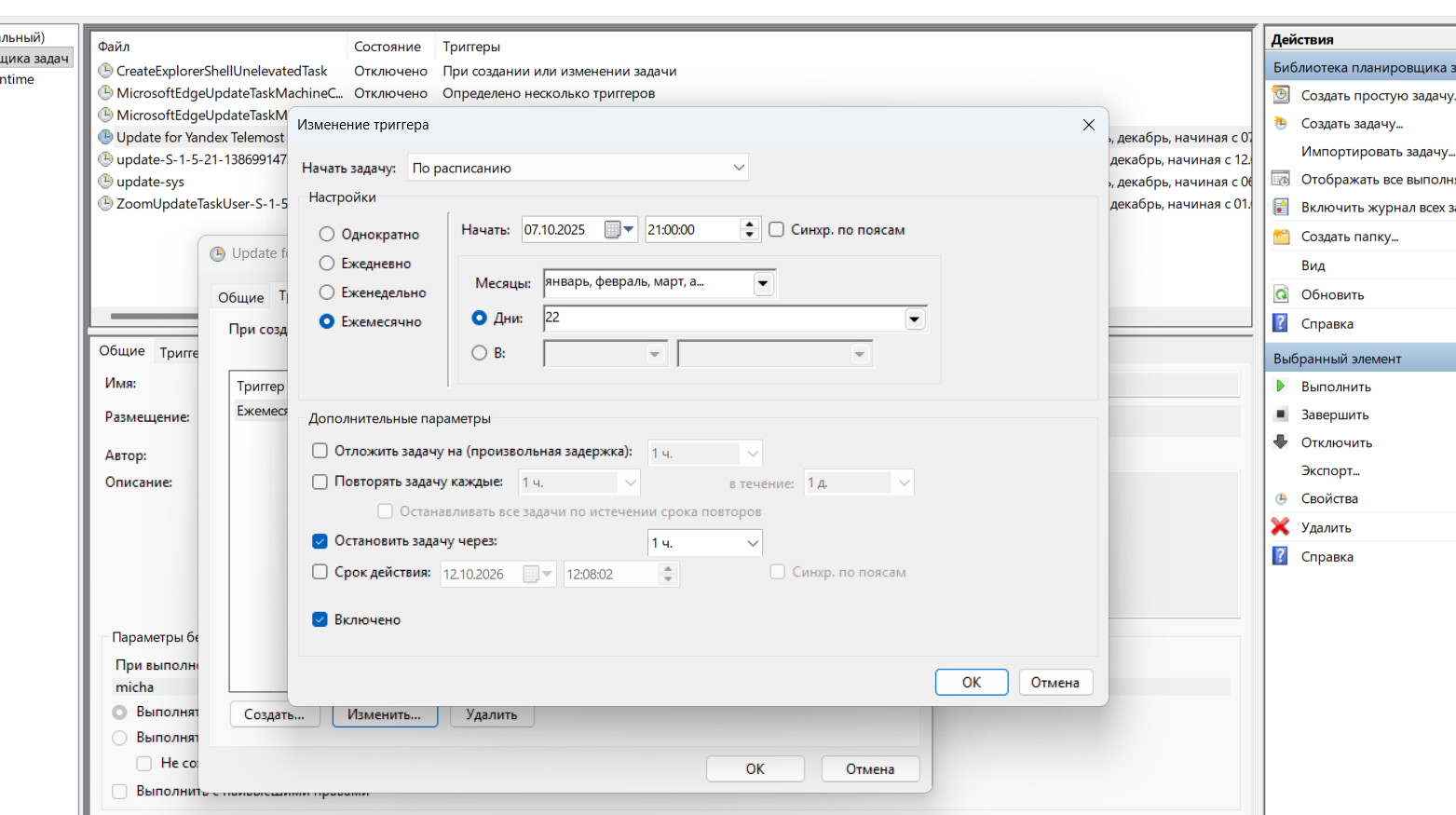 Из дополнительных параметров я включаю «Остановить задачу через 1 час». Чтобы в случае, если, например, обновление "зависнет", оно не продолжало грузить компьютер. Времени 1 час вполне достаточно для полного выполнения обновления. В ином случае, это обновление должно быть прекращено.