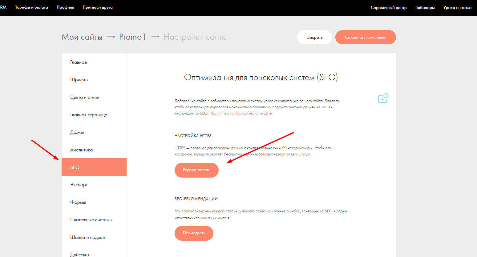 Финальный штрих - HTTPS. С этим тоже не нужно заморачиваться: Тильда сама выпускает SSL-сертификат через Let’s Encrypt. После того, как у вас заработал поддомен, подождите несколько минут и перейдите в раздел "SEO" >> "Настройка HTTPS". Нажмите "Редактировать".