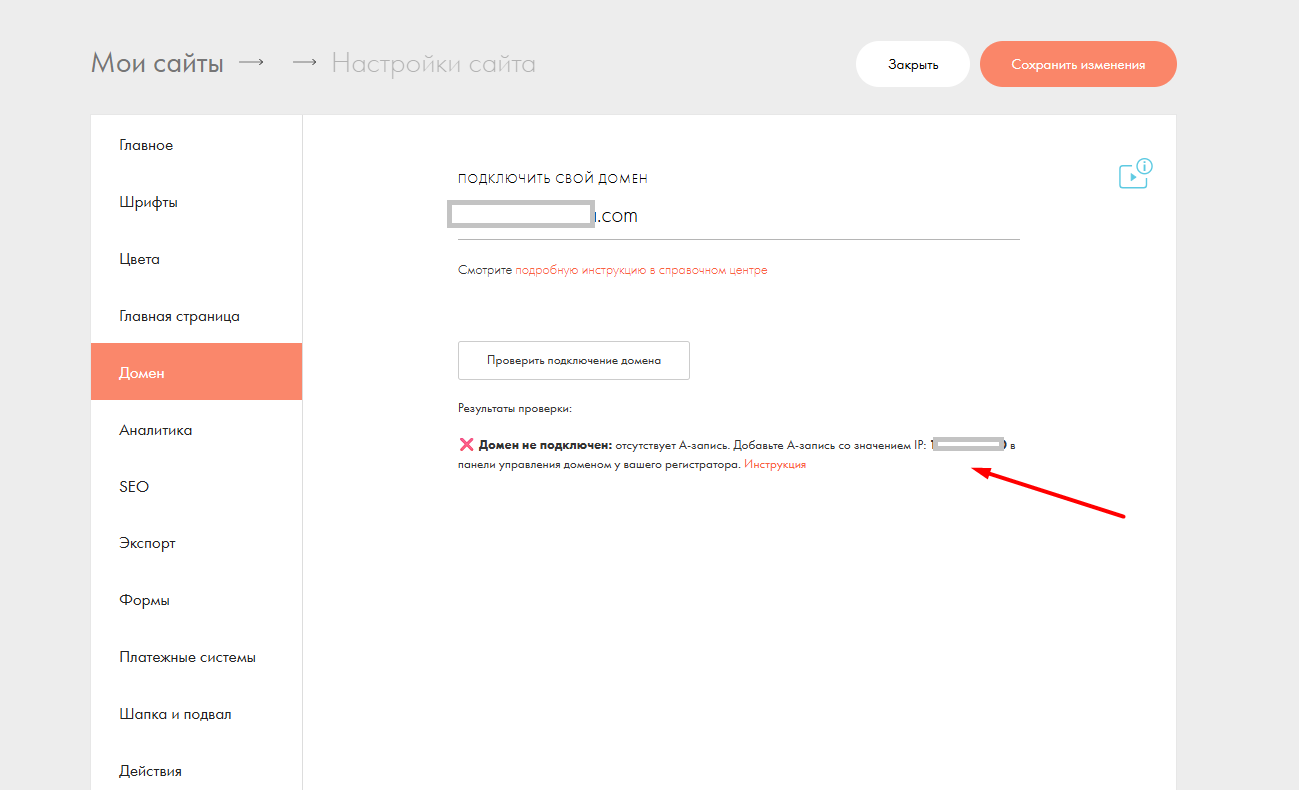 Итак, откуда берем IP-адрес, который добавляем в поле "Значение"? В настройках сайта на Тильде в разделе "Домен" мы увидим сообщение о том, какой IP нам нужно указывать в А-записи.