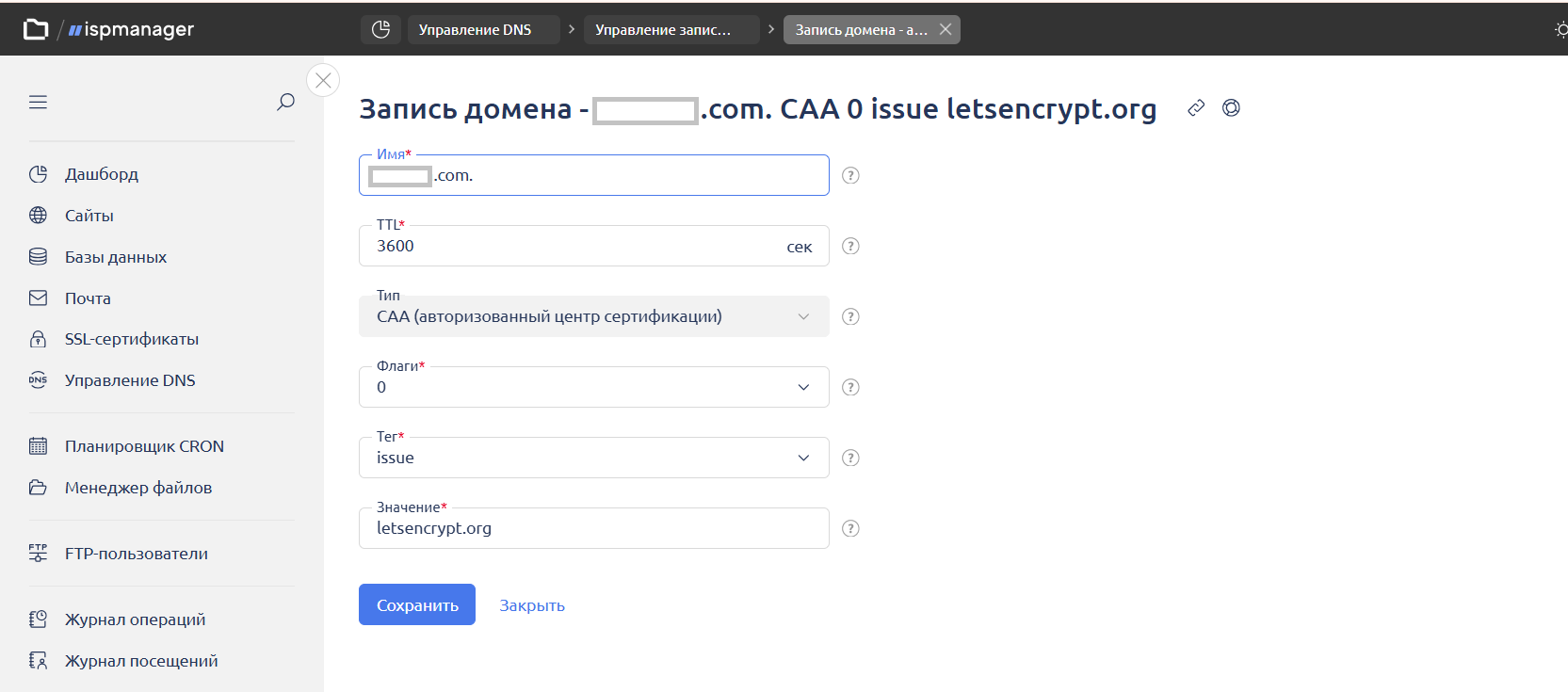 Добавление CAA-записи в домен