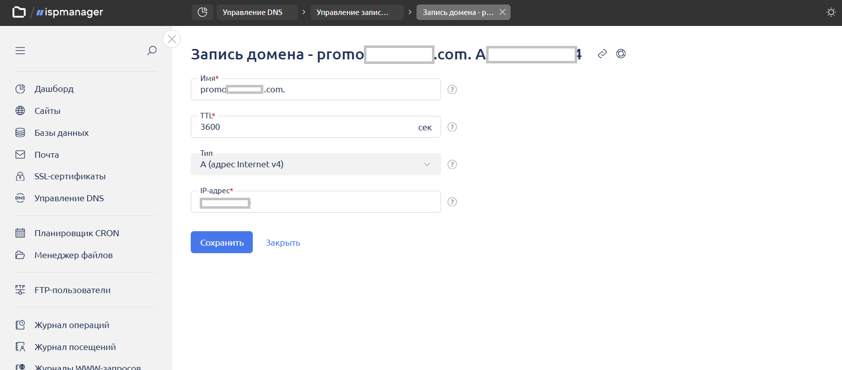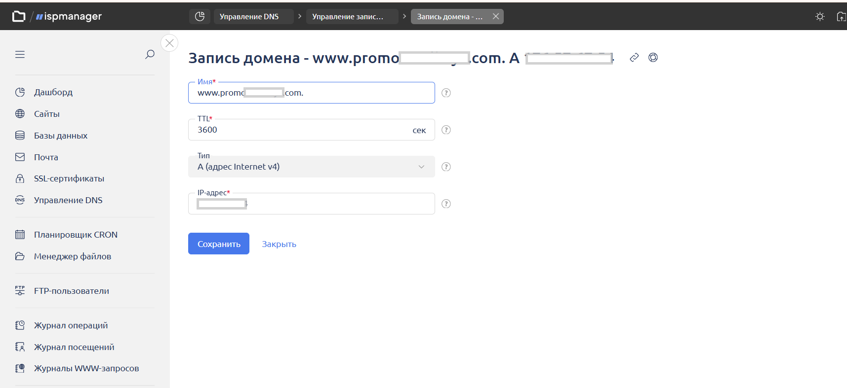 Важно! После добавления имени в A-запись, оно может сохраниться как promo.site.com. и www.promo.site.com. Это нормально! Ничего менять не надо