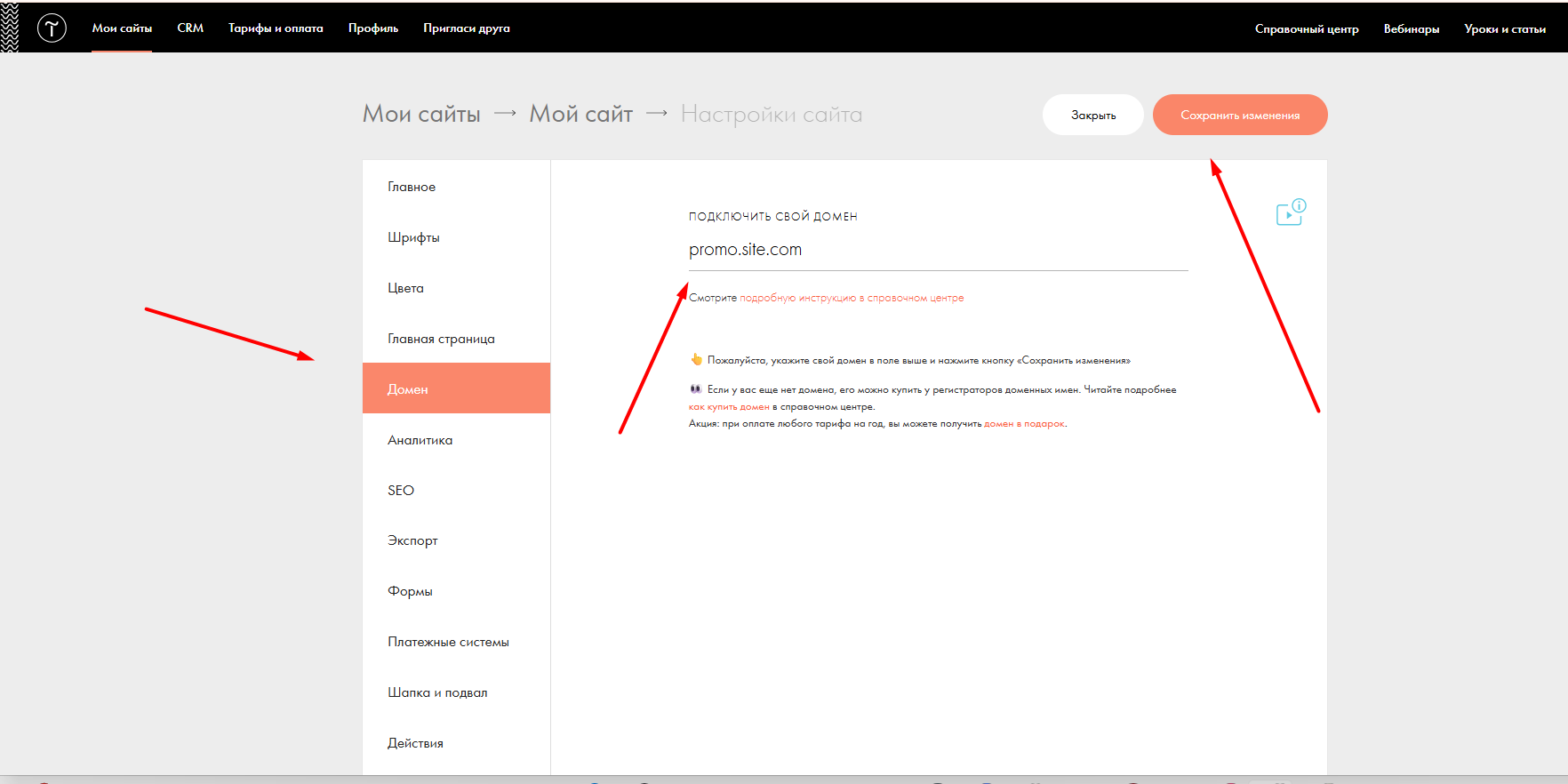 Далее в настройках переходим в раздел "Домены", вписываем наш поддомен и нажимаем сохранить. Конечно, пока ничего работать не будет, но мы зафиксировали поддомен на Тильде.